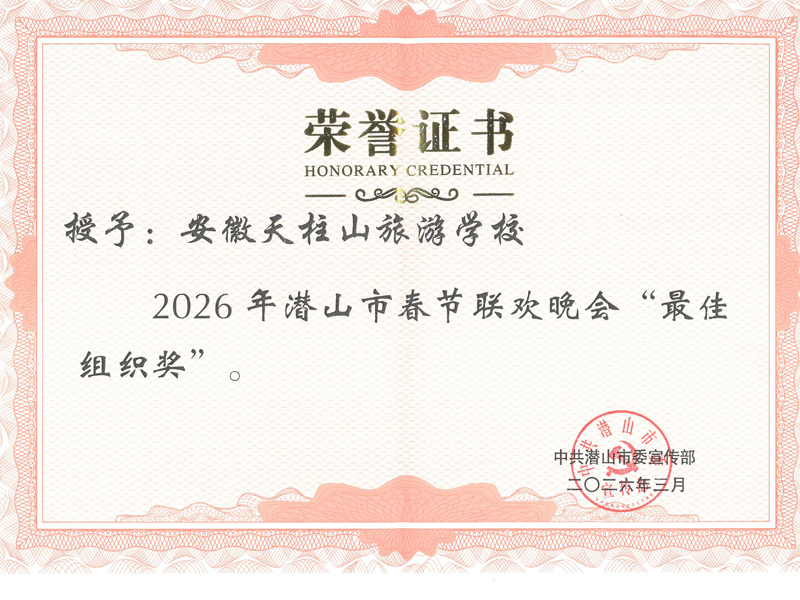 本次活动由潜山市委宣传部、市文旅体局、市文联、市融媒体中心联合主办,市文化馆承办,旨在表彰春晚群众喜爱的精品节目,展现地方文化风采,凝聚文化自信。评选中,安徽天柱山旅游学校选送的歌舞《吉祥》凭借精彩表现,从众多节目中脱颖而出,荣获“最佳表演奖”。学校获评“最佳组织奖”,方宇等四名同学获“优秀志愿者奖”。