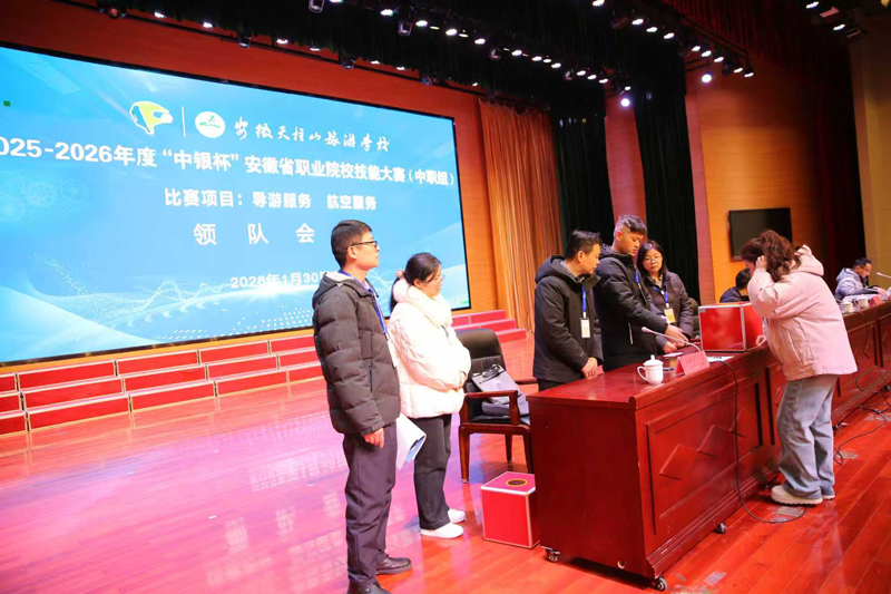 1月30日至2月1日,由安徽省教育厅、安徽省工业和信息化厅、安徽省人力资源和社会保障厅、安徽省残疾人联合会联合主办的2025-2026年度“中银杯”安徽省职业院校技能大赛(中职组)“导游服务”“航空服务”两个赛项在安徽天柱山旅游学校顺利进行,共有来自全省16个地级市44所中职学校196名参赛师生参加了此次比赛。